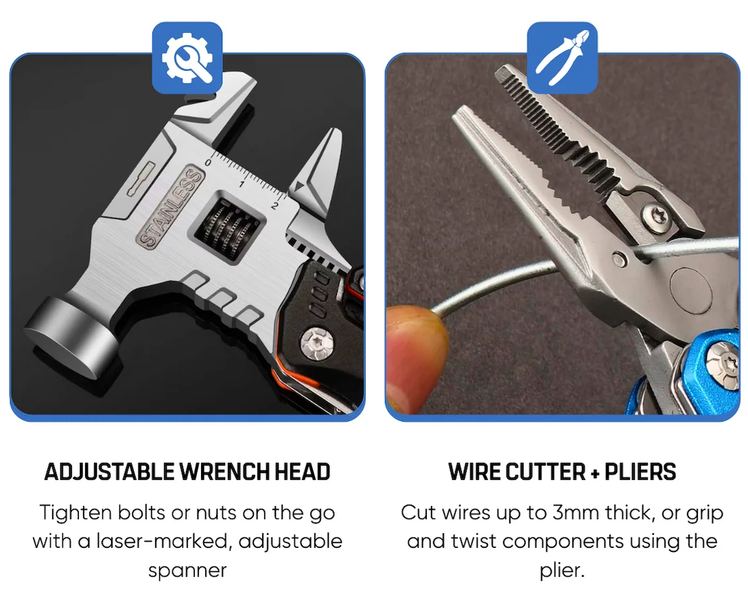 Imagine having an entire toolbox in your hand! With 18 essential functions including a unique adjustable wrench, high-hardness wire cutters, hammer, and knife, this all-in-one solution saves space and keeps you prepared for anything.
